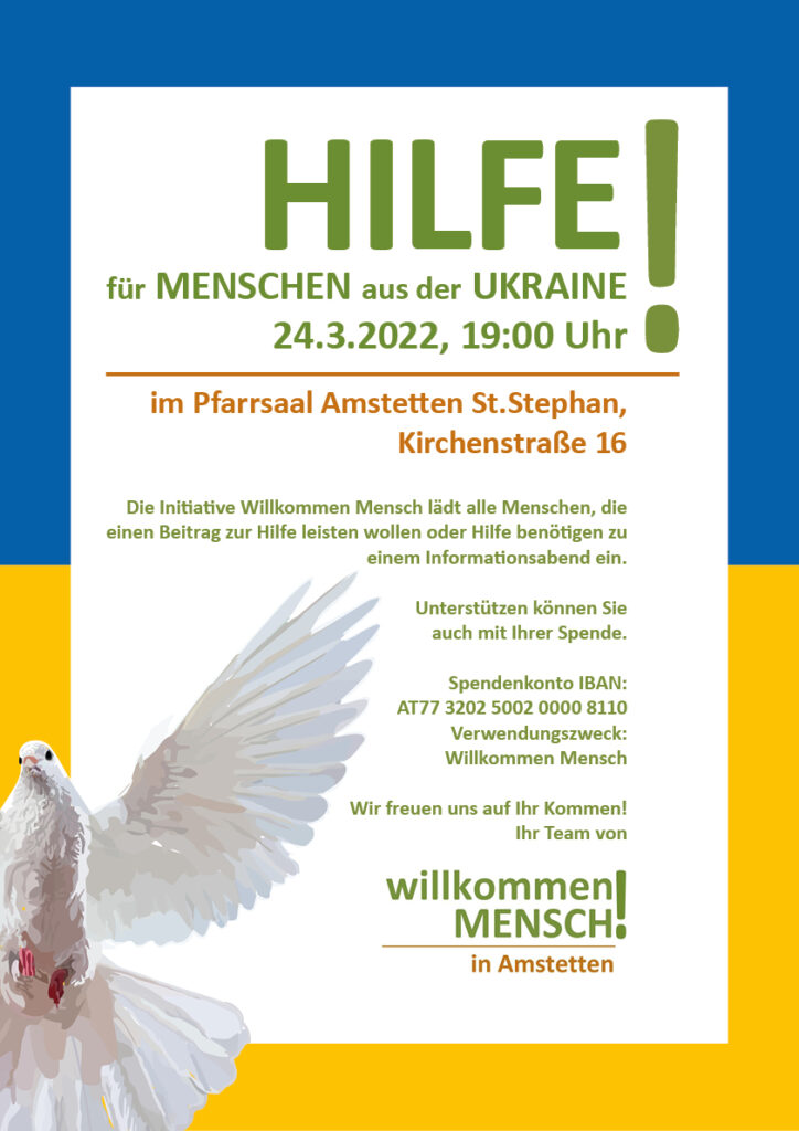 Wir laden am Donnerstag, 24. März um 19.00 Uhr zu einem Informationsabend zum Thema „Hilfe für Menschen aus der Ukraine“ in den Pfarrsaal Amstetten St. Stephan, Kirchenstraße 16 ein.